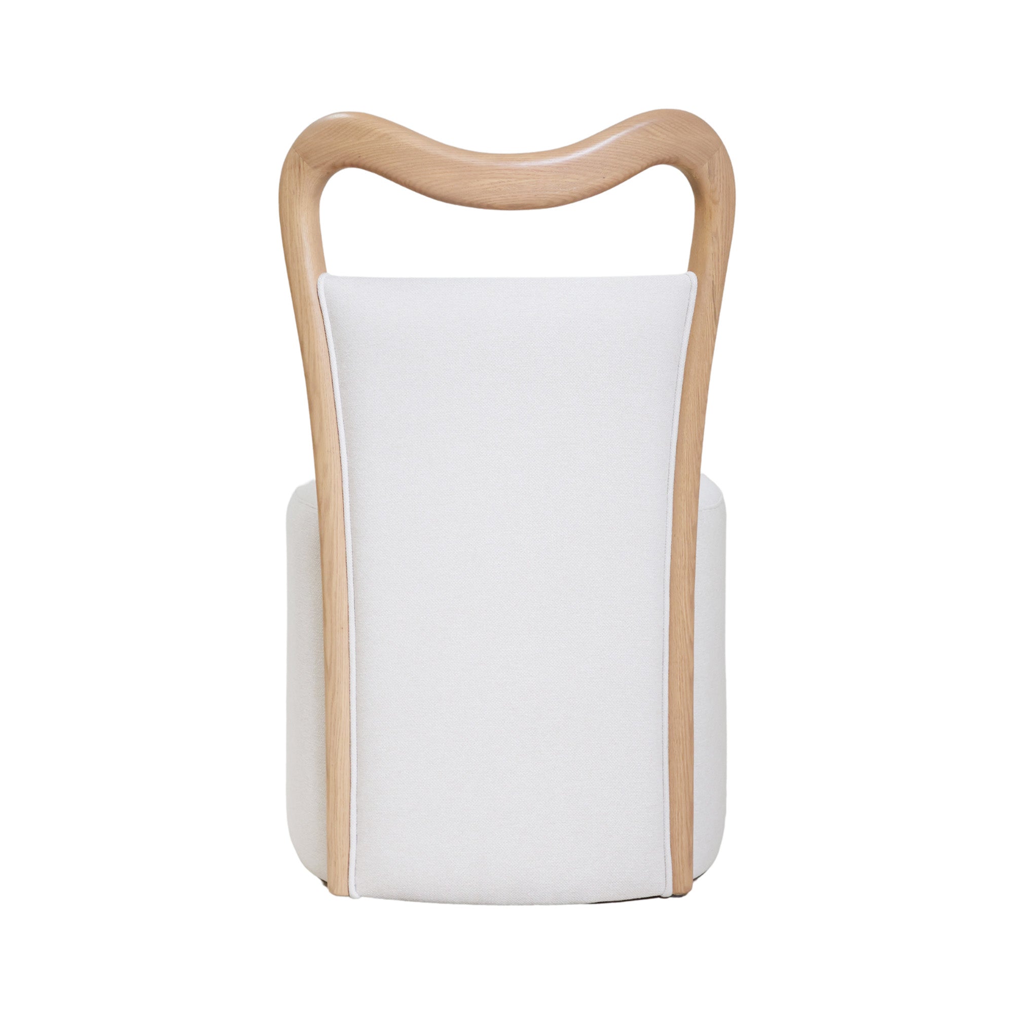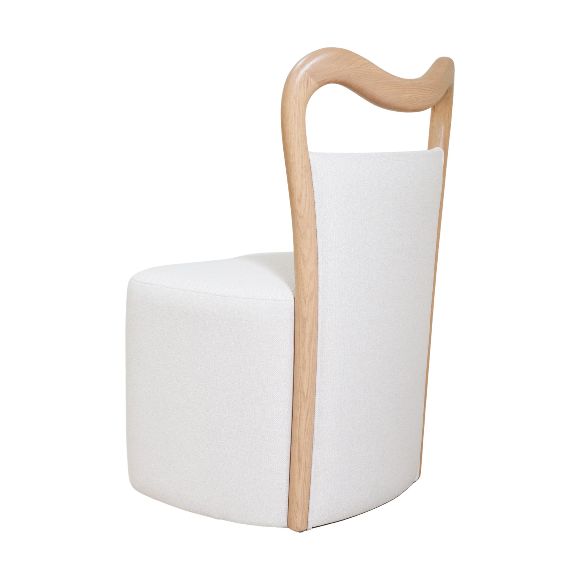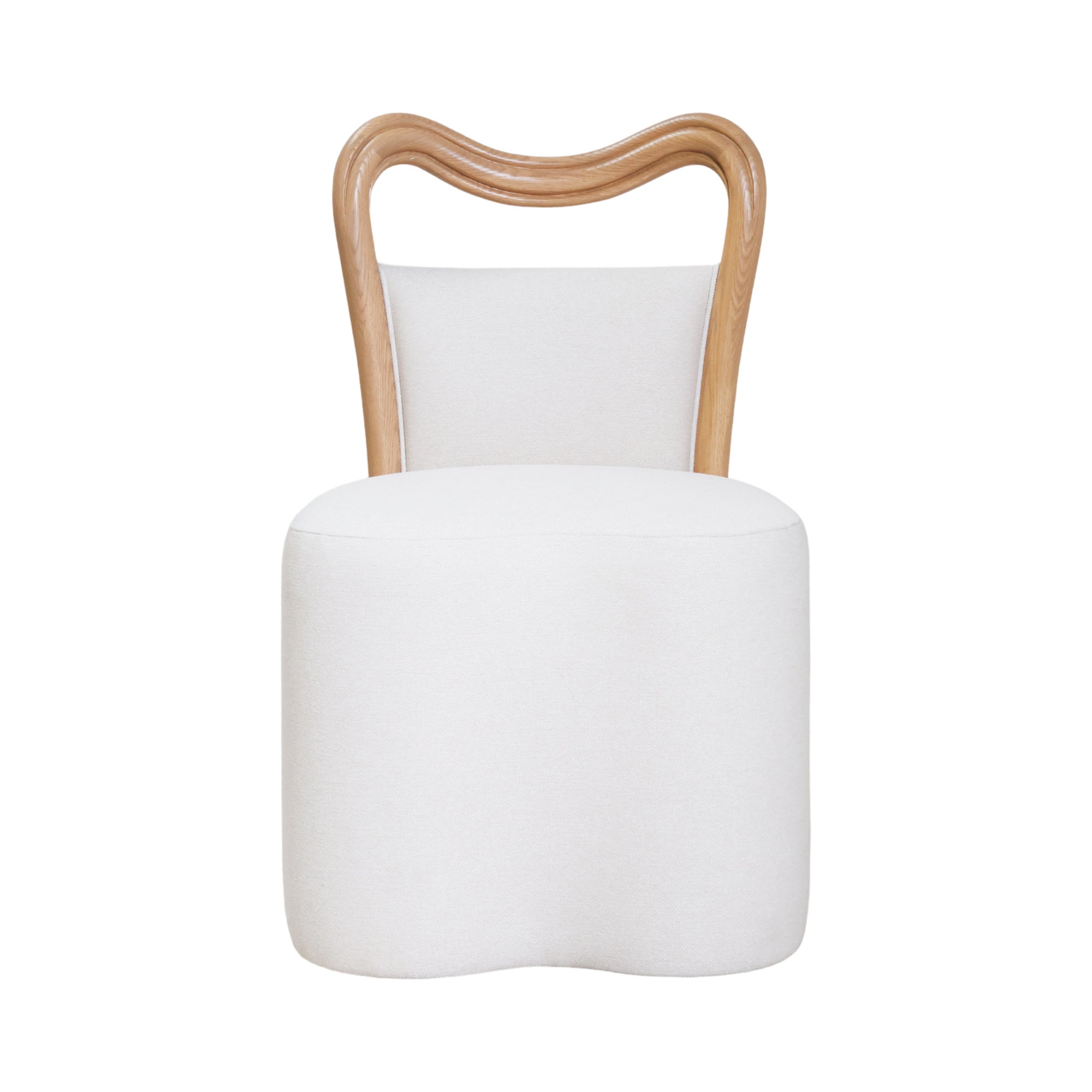 Our Waters Dining Chair reimagines modern elegance with its distinctive W-shaped curve in both the back and base. The warm oak wood frame contrasts beautifully with the soft ivory linen upholstery that wraps seamlessly to the floor, creating a sleek, flowing silhouette.