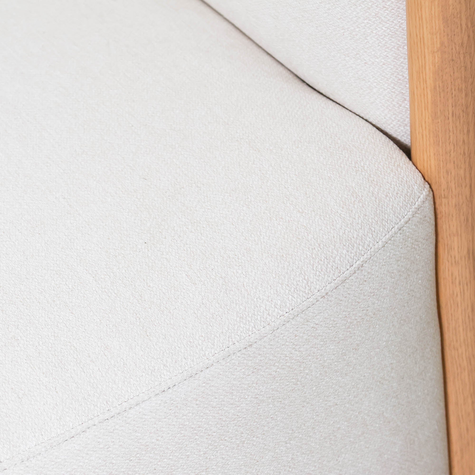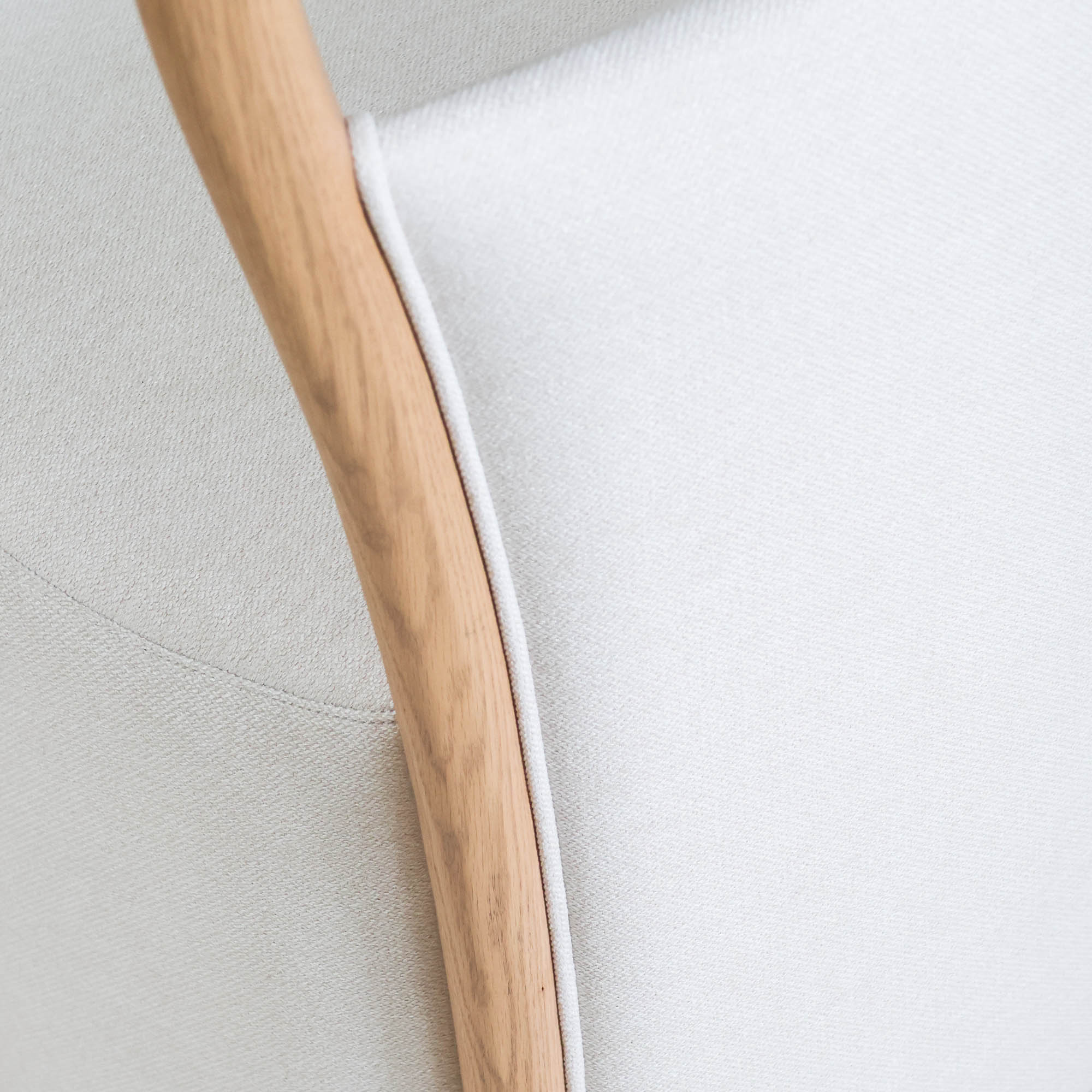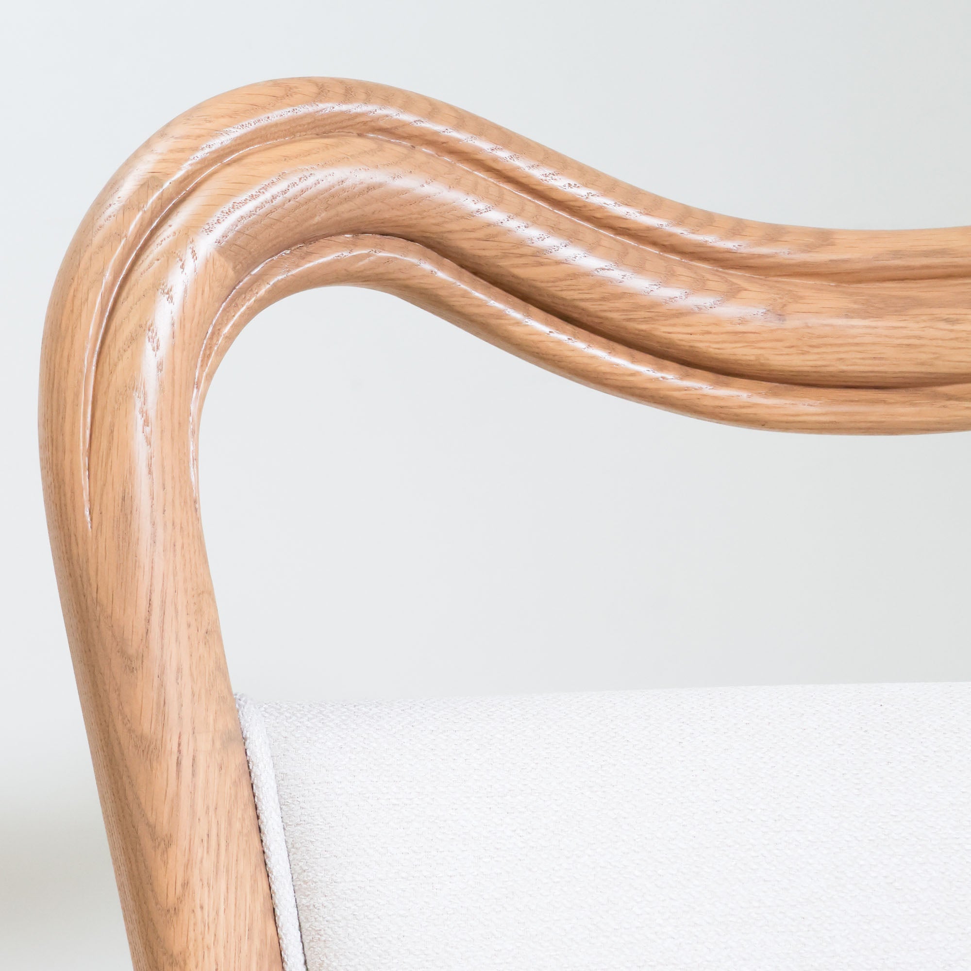 Our Waters Dining Chair reimagines modern elegance with its distinctive W-shaped curve in both the back and base. The warm oak wood frame contrasts beautifully with the soft ivory linen upholstery that wraps seamlessly to the floor, creating a sleek, flowing silhouette.